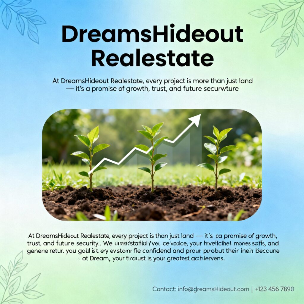 DREAMS HIDEOUT రియల్ ఎస్టేట్ లో ప్రతి ప్రాజెక్టు కేవలం స్థలం మాత్రమే కాదు — అది మీ భవిష్యత్తుకి ఇచ్చిన నమ్మకపు హామీ. మీ సంపాదన ఎంత విలువైనదో మేము అర్థం చేసుకుంటాము. అందుకే మేము ప్రతి వెంచర్ ని చట్టపరంగా, భద్రంగా, మరియు లాభదాయకంగా ఎంపిక చేస్తాము. ప్రతి కస్టమర్ తన పెట్టుబడిపై గర్వంగా, నమ్మకంగా ఉండాలని మా లక్ష్యం. ఎందుకంటే DREAMS HIDEOUT లో మీ నమ్మకమే మా పెద్ద విజయము.